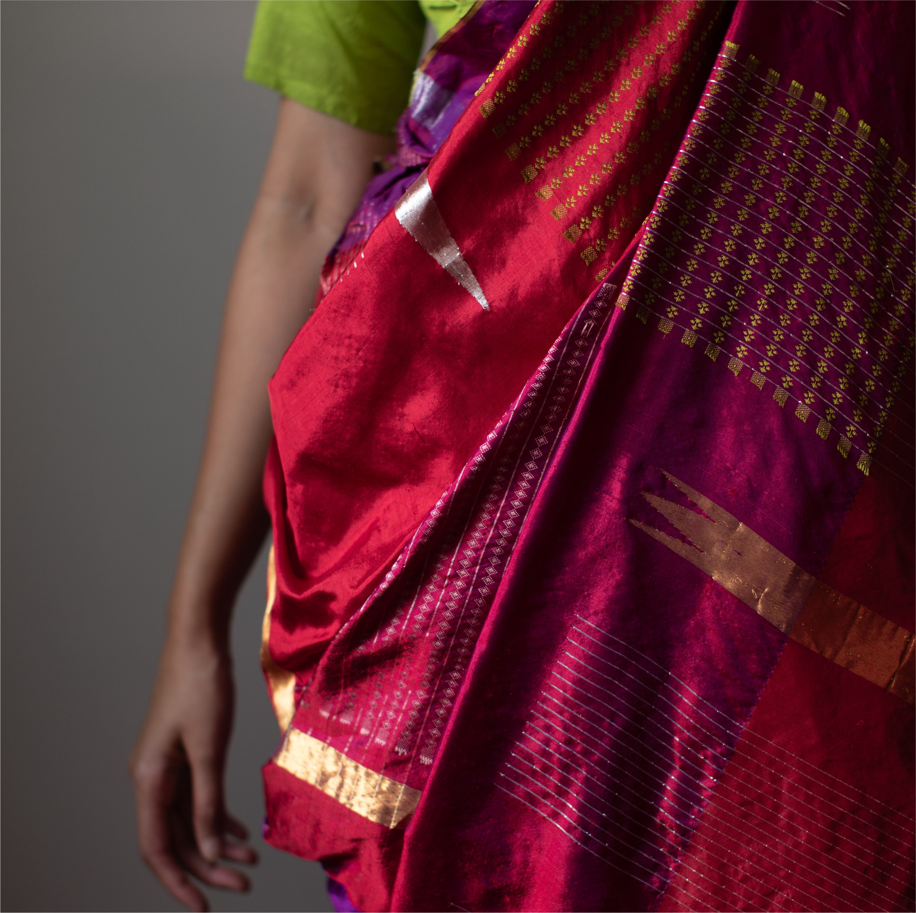 The avant-garde Khana sari blends tradition with modernity, reinterpreting the classic Guledgudda Khana—also known as Khun—which was traditionally woven on a 32-inch loom and primarily used as a blouse fabric.